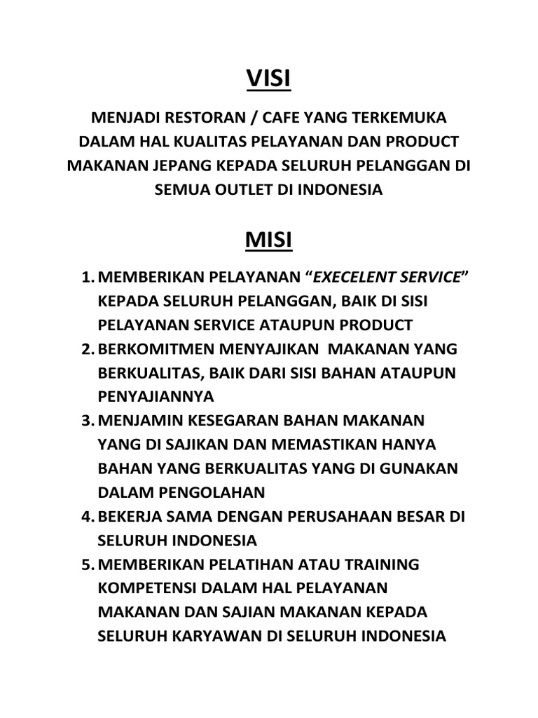 Diposting oleh Dinda Roselina di 0447. Dengan adanya visi misi ini calon konsumen akan lebih yakin bahwa pelayanan yang anda berikan. Mempersatukan persepsi dan penentuan kebijakan serta strategi yang akan dipakai atau dikembangkan restoran.